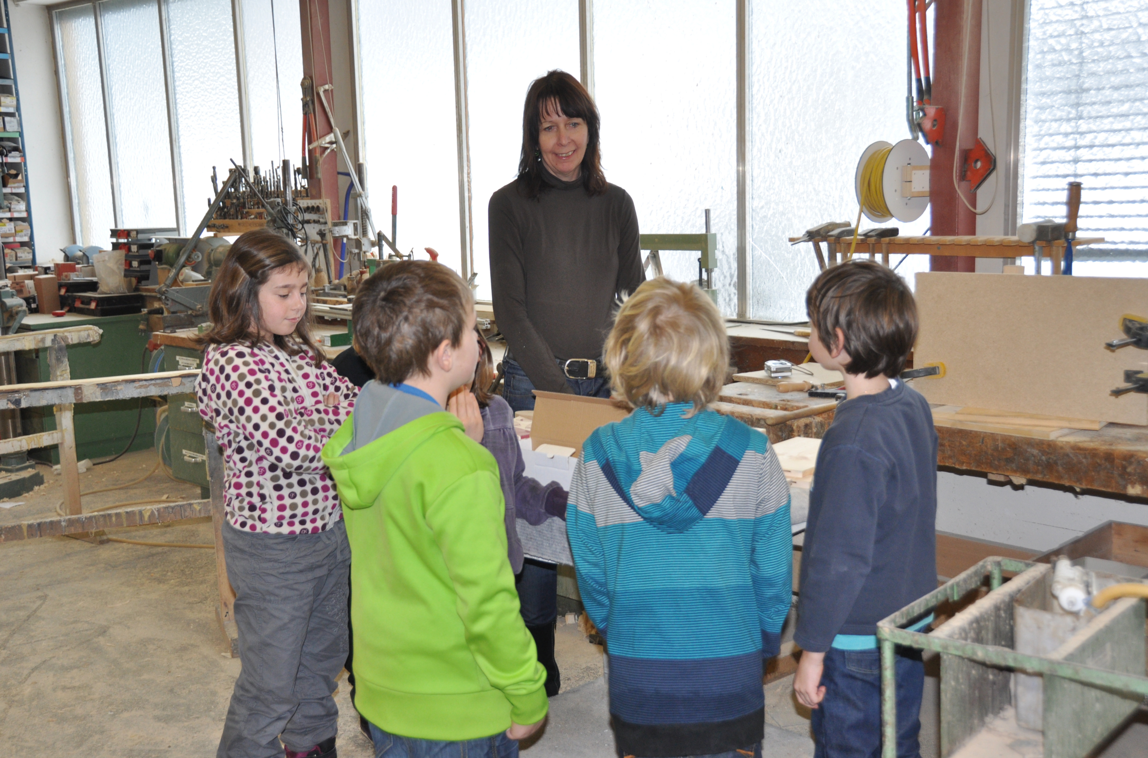 Seniorchef Gebhard Rüscher zeigt den Kindern der Volksschule Schnepfau wie die Arbeit in einem Tischlereibetrieb aussieht.
