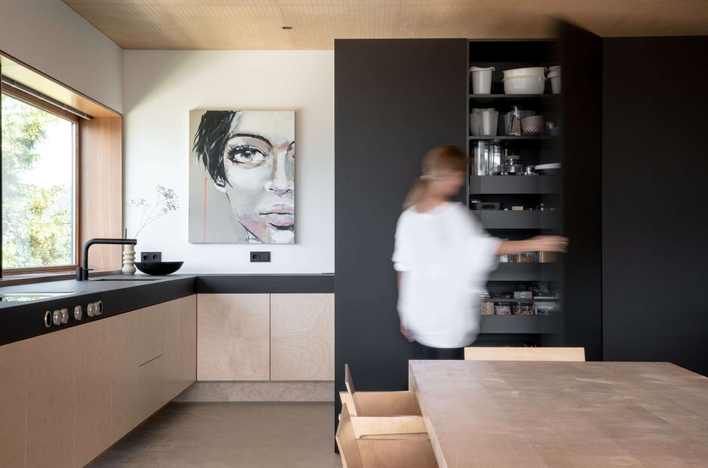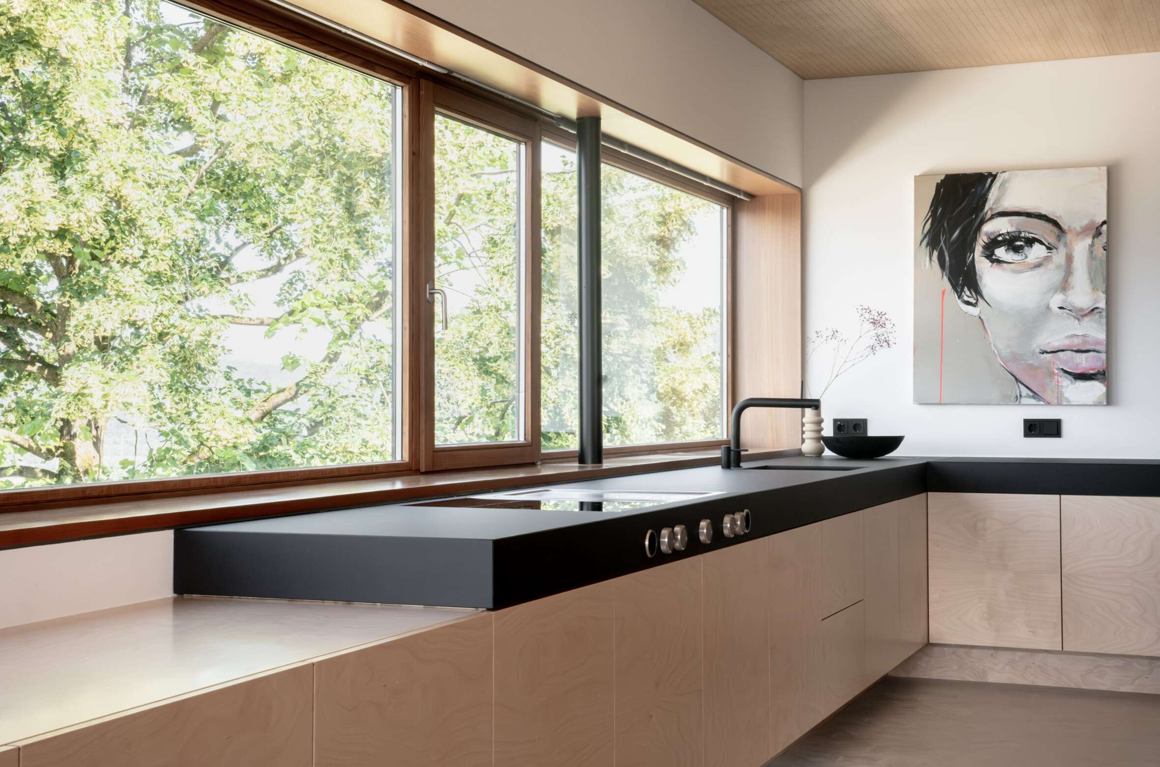 Ein Materialmix aus Birke und schwarzem Schichtstoff Fenix mit Anti-Fingerprint-Beschichtung macht diese Küche zu einem echten Wohlfühlort. Die grifflose Ausführung wirkt aufgeräumt und schlicht und ist außerdem sehr pflegeleicht. Auf der widerstandsfähigen Arbeitsplatte aus schwarzem Lapitec mit flächenbündigem Kochfeld macht das Kochen richtig Spaß.